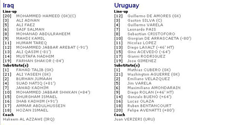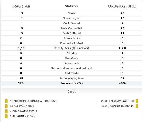 Baik Irak maupun Uruguay, keduanya gagal mengubah kedudukan di babak tambahan. Pertandingan dilanjutkan dengan adu penalti dan dimenangkan oleh La Celeste muda 7-6.