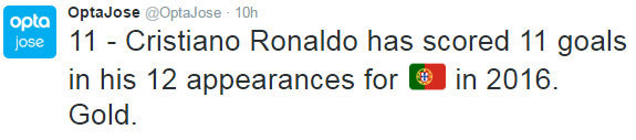 Dengan begitu, berarti Ronaldo sudah mencetak 11 gol dalam 12 penampilannya bersama Portugal sepanjang tahun 2016. Gol-golnya jugalah yang turut berperan membawa Portugal menjuarai Euro 2016.