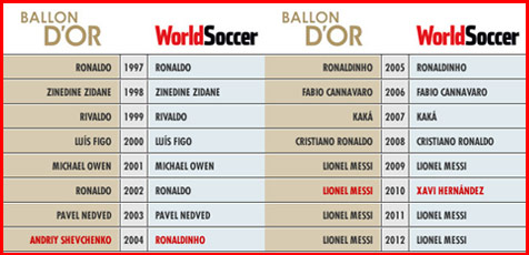 World Soccer Player of The Year seringkali disebut sebagai Ballon d'Or mini. Pasalnya, pemenang penghargaan ini sebagian besar juga akan menjadi pemenang Ballon d'Or. Tahun lalu Ronaldo yang mendapat penghargaan ini juga memenangkan Ballon d'Or. Berikut adalah perbandingan daftar pemenang World Soccer dan Ballon d'Or dari 1997 hingga 2012.