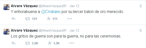 Rupanya aksi tersebut menuai reaksi negatif dari sejumlah pihak, salah satunya adalah striker Getafe, Alvaro Vazquez. Melalui akun Twitter miliknya, pemain 23 tahun ini mencibir aksi 'teriakan perang' Ronaldo sebagai sesuatu yang kurang pantas dilakukan di acara formal.