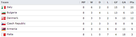 Hasil pahit diTurin merupakan kekalahan ketiga secara beruntun yang ditelan Ceko di kualifikasi Grup B zona Eropa setelah sebelumnya mereka dihantam Denmark 0-3 dan ditekuk Armenia 1-2. Ceko kini menempati peringkat empat klasemen sementara dengan poin 9 atau terpaut 11 poin dari Italia, yang telah memastikan diri lolos ke Brasil 2014, dan tertinggal 4 poin dari peringkat dua Bulgaria dengan dua laga tersisa.