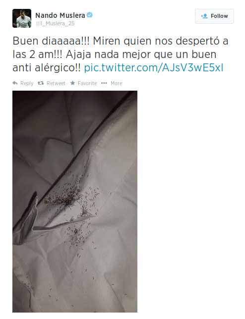 Muslera kemudian sempat mengunggah foto kamarnya yang penuh dengan rayap, yang kemudian lebih terlihat seperti semut, dalam akun Twitter miliknya.