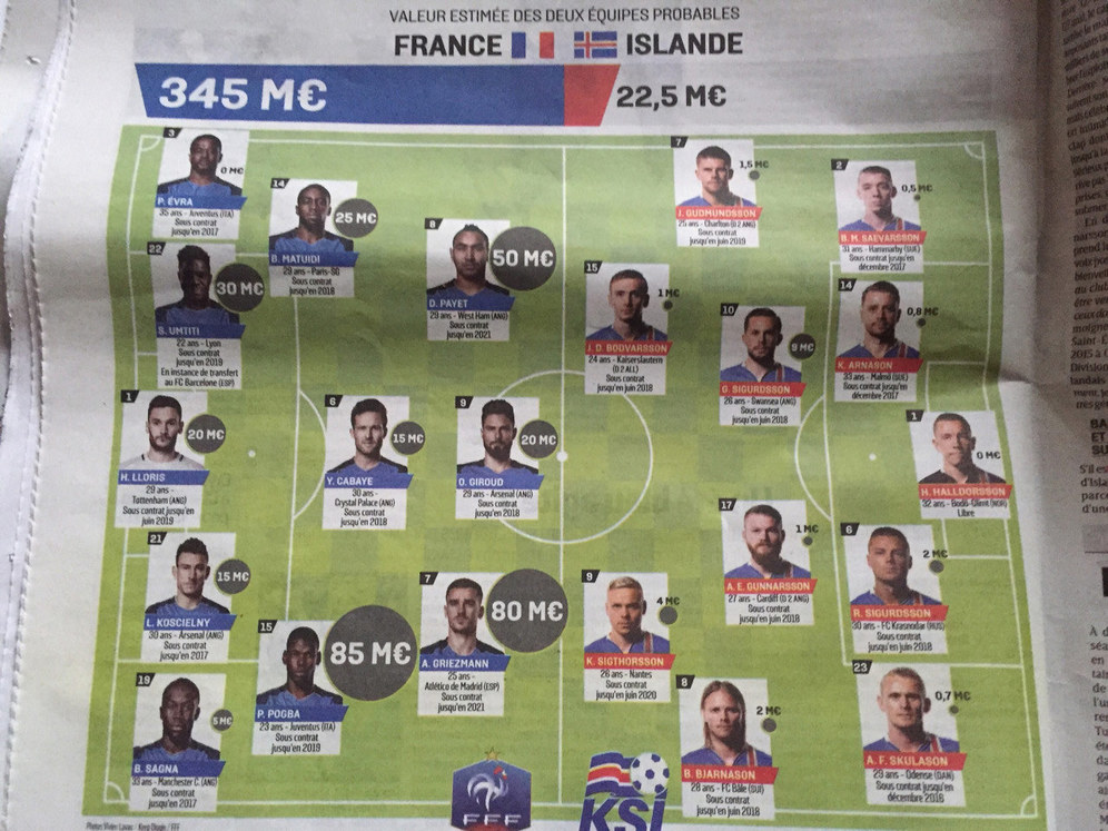 Dalam perkiraan starting line-up yang mereka usung, dicantumkan pula perkiraan nilai masing-masing pemain di lantai bursa. Jika ditotal, starting XI potensial Prancis bernilai setidaknya 16 kali lipat daripada Islandia.