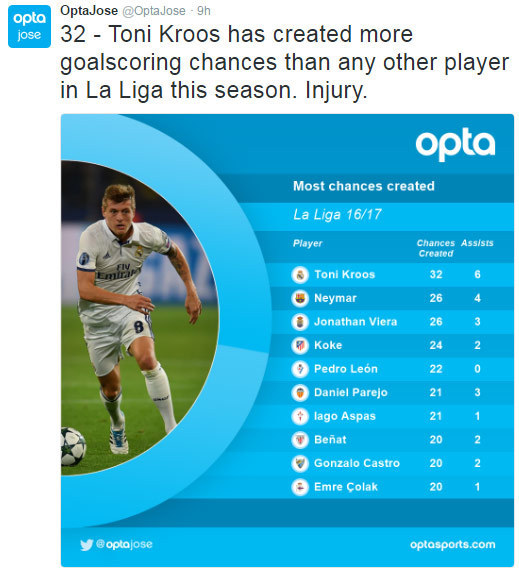 Menciptakan rata-rata 2,9 peluang gol per laga, keberadaan Kroos jelas sangat penting di skuat Madrid. Dengan enam assist yang sudah diukirnya di La Liga musim ini, kita bisa lihat betapa besar kontribusinya bagi Los Blancos.