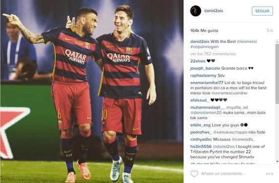 Alves pun langsung mengunggah gambar dirinya bersama Messi, usai Barcelona menggondol trofi Piala Super Eropa di Tbilisi