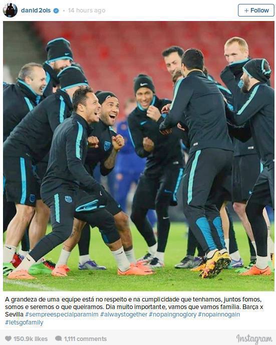 "Kehebatan sebuah tim terletak pada kebersamaan dan kerja sama antar pemain, kami terus melakukan itu dan apapun yang terjadi kami akan terus bersama," tulis Alves.