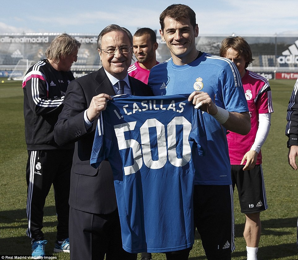 Kedua sosok penting Madrid itu menerima hadiah khusus dari sang presiden klub, Florentino Perez. Ancelotti mendapat jersey dengan nama dirinya dan nomor '100', sementara Casillas juga menerima hadiah serupa dengan nomor punggung '500'.