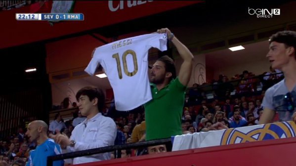 Itulah yang terjadi pada laga antara Real Madrid dan dini hari tadi. Seorang fans yang tidak diketahui identitasnya, dengan bangga mengacungkan jersey Los Blancos lengkap dengan nama Messi dan nomor punggung 10 di bagian belakang!