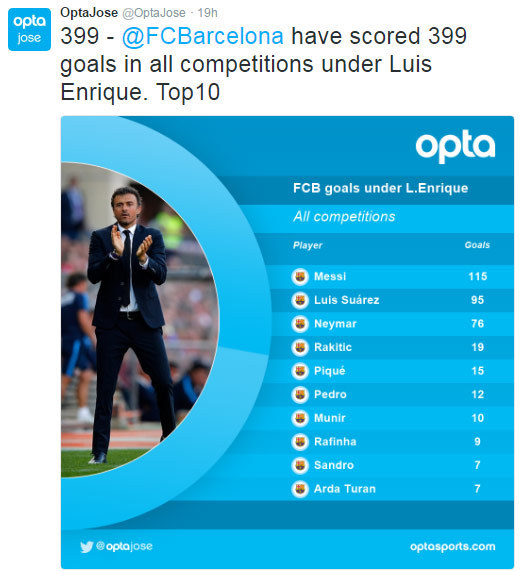 Enrique punya 22 pencetak gol sejak pertama kali menangani Barcelona. Dari 22 pencetak gol Barcelona era Enrique itu, Lionel Messi adalah kontributor terbanyak dengan 115 golnya.