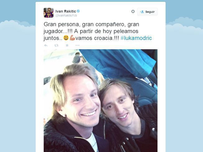 Setelah keduanya sempat saling bertarung untuk mengalahkan satu sama lain di duel antara kedua tim di Camp Nou kemarin, Modric dan Rakitic, yang masing-masing membela Madrid dan Barcelona, menunjukkan keakraban mereka di jejaring sosial Twitter.