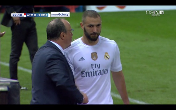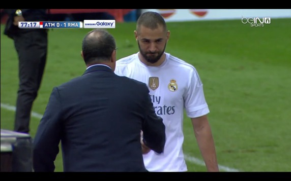 Benzema, yang diminta keluar untuk memberikan jalan pada Mateo Kovacic, terlihat tidak senang dengan keputusan sang manajer kala ia berjalan di pinggir lapangan.