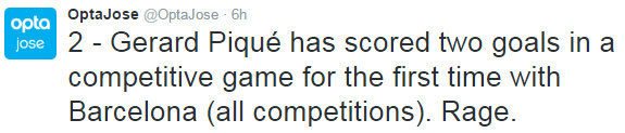 Selama ini, Pique sudah beberapa kali mencetak gol di laga-laga kompetitif Barcelona. Namun, dia selalu mencetak maksimal satu gol ke gawang lawan. Menghadapi Celta dini hari tadi, untuk pertama kalinya dia menyarangkan dua gol dalam satu laga (brace).