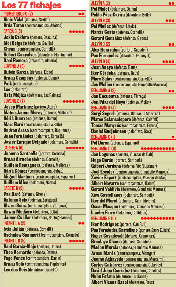 Selain Turan dan Vidal, ada beberapa nama yang menarik seperti Robert Goncalves, yang baru didatangkan dari dan akan diproyeksikan bermain di Barcelona B. Selain itu ada pula pemain berbakat asal Korea Selatan, , yang akan membela tim Juvenil A. Tak lupa di bagian tim Benjamin B, terdapat sosok Daniel Gudjohnsen, yang merupakan buah hati mantan pemain Barcelona, Eidur.
