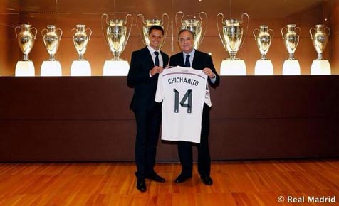 Chicharito mendapatkan jersey itu dalam acara seremonial setelah penandatanganan kontrak di Santiago Bernabeu. Presiden Madrid Florentino Perez memberikan hadiah berupa replika stadion Santiago Bernabeu, jam tangan dan jersey nomor 14 dengan nama Chicharito. (rmfc/hsw)