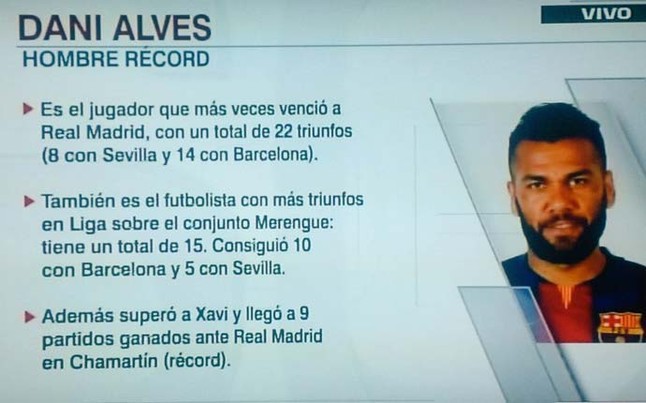 Lebih lanjut, Alves juga merupakan pemain yang paling banyak memetik kemenangan atas Madrid di semua level kompetisi, yakni 22 kemenangan. 8 bersama Sevilla dan 14 bersama Barcelona.
