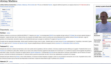 Bola.net - Jeremy Mathieu, bek anyar Barcelona, belum lama ini mendapat hinaan di halaman profil Wikipedia, oleh seorang pengguna yang tak diketahui identitasnya. Dengan tak bertanggung jawab, sang pelaku mengubah beberapa data pribadi sang pemain seperti nama dan tanggal lahir.