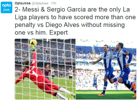 Alves, yang juga mantan pemain Almeria, memang salah satu spesialis pembunuh penalti di La Liga. Sejauh ini, di kompetisi ini, hanya ada dua orang yang pernah membobol gawangnya lebih dari satu kali lewat titik putih. Dua orang itu sama-sama berasal dari klub yang berbasis di Catalan. Yang pertama adalah Lionel Messi dari Barcelona. Satunya lagi adalah Sergio Garcia, penyerang Espanyol periode 2010-2015.
