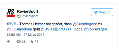 Belum lama ini, Thomas Helmer, yang pernah memperkuat Dortmund antara tahun 1986-92, mengkonfirmasi bahwa Gundogan akan meninggalkan klub dan pergi memperkuat Barcelona, melalui akun Twitter resmi Revier Sport. Hal tersebut konsisten dengan laporan yang sebelumnya mengabarkan Gundogan telah lolos tes medis bersama Blaugrana.