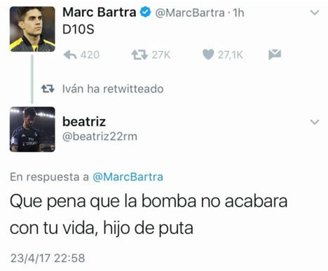 Menariknya, selalu saja ada balasan tak mengenakkan yang diterima Bartra dari para netizen. Dua di antara balasan tersebut bahkan bernada seperti menyumpahi Bartra tewas terkena bom.