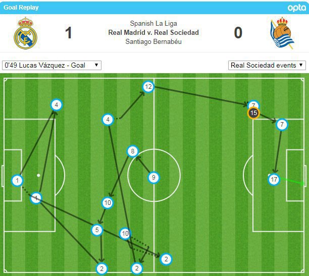 Bola memang sempat membentur kaki pemain Sociedad saat Ronaldo melakukan gocekan sebelum mengirim umpan. Tapi, bola tidak sampai dalam penguasaan pemain Sociedad dan kembali ke kaki Ronaldo. Sebelum akhirnya di melepas umpan yang dikonversi jadi gol oleh Vazquez.