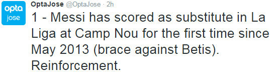 Terakhir kali mencetak gol sebagai pemain pengganti di Camp Nou di La Liga adalah ketika melawan Real Betis pada Mei 2013. Waktu itu, Messi masuk menggantikan David Villa menit 56 saat skor imbang 2-2. Messi kemudian mencetak dua gol pada menit 60 serta 71 dan memastikan Barcelona menang 4-2.