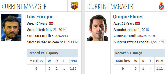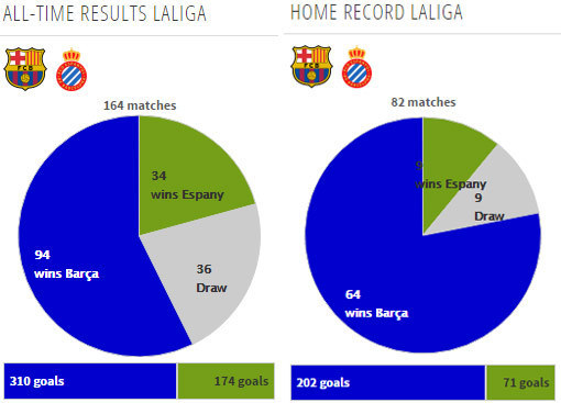 Barcelona selalu menang dalam tujuh laga kandang terakhirnya melawan Espanyol di La Liga. Musim lalu, Barcelona membantai Espanyol 5-0 di Camp Nou lewat gol-gol Lionel Messi, Luis Suarez (2), dan Neymar.