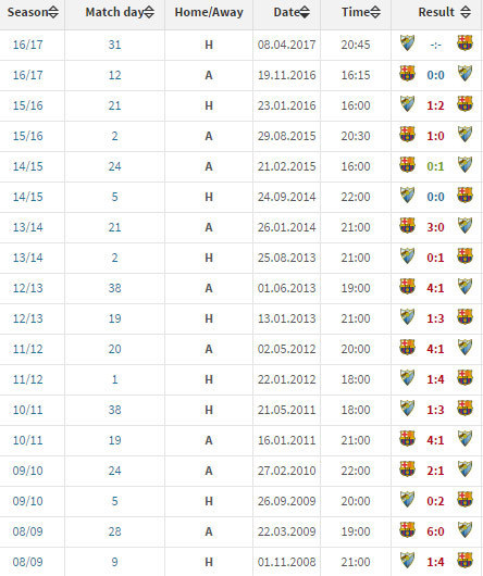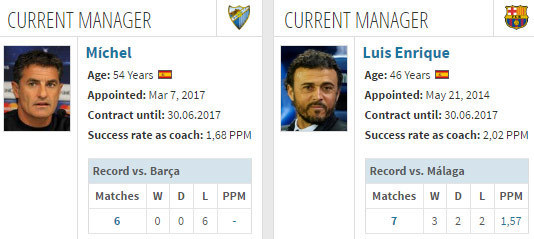 Bola.net - - Peringkat 15 Malaga (30 poin) akan menjamu peringkat 2 Barcelona (69 poin) di jornada 31 La Liga 2016/17, Minggu (09/4). Malaga tak pernah menang (S1 K2) dalam tiga pertemuan terakhir melawan Barcelona.