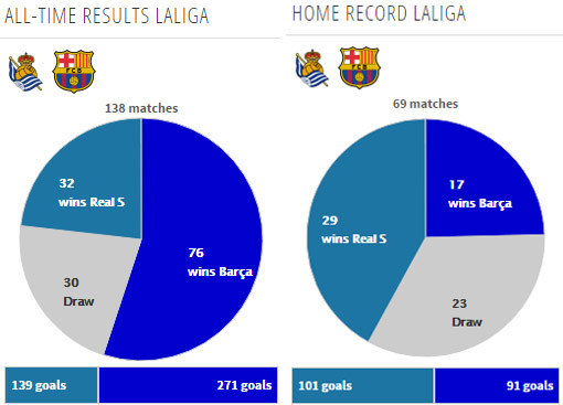 Bola.net - - Peringkat 5 Real Sociedad akan menjamu peringkat 2 Barcelona di jornada 13 La Liga 2016/17, Senin . Berikut catatan head-to-head kedua tim.