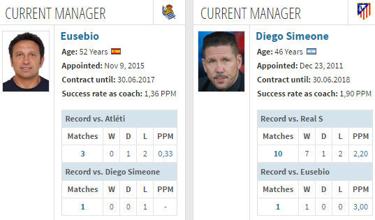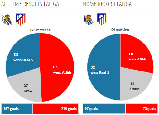 Dalam enam laga tandang terakhirnya melawan Sociedad di La Liga, Atletico menang lima kali dan cuma sekali kalah. Dalam enam laga tersebut, Atletico mencetak 14 gol dan hanya kebobolan lima.