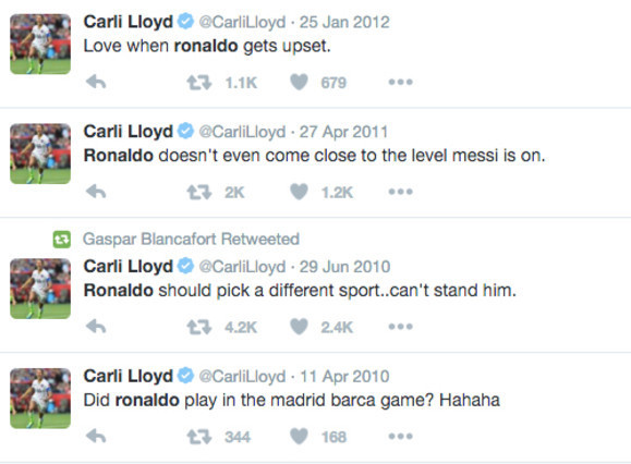 Pada 2010 silam, ia menulis: "Saya amat suka melihat Cristiano Ronaldo marah." Sementara di kesempatan lainnya ia menulis: "Apakah Cristiano Ronaldo bahkan bermain di pertandingan antara Real dan Barca? Hahaha!"