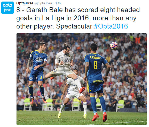 Total delapan gol sundulan dicetak Bale bersama Madrid di La Liga dari periode awal Januari sampai akhir Desember 2016. Selama periode itu, tak ada pemain lain di La Liga yang kepalanya lebih tajam daripada winger asal Wales tersebut, termasuk sang partner Cristiano Ronaldo dan Sergio Ramos.