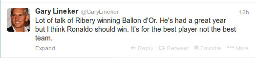 "Ada banyak pembicaraan mengenai kemungkinan Ribery memenangkan Ballon d'Or. Ia mengalami tahun yang hebat, namun saya pikir Ronaldo harus menang. Penghargaan ini dibuat untuk pemain terhebat, bukan tim terhebat," tulis Lineker dalam akun Twitter resminya, @GaryLineker.