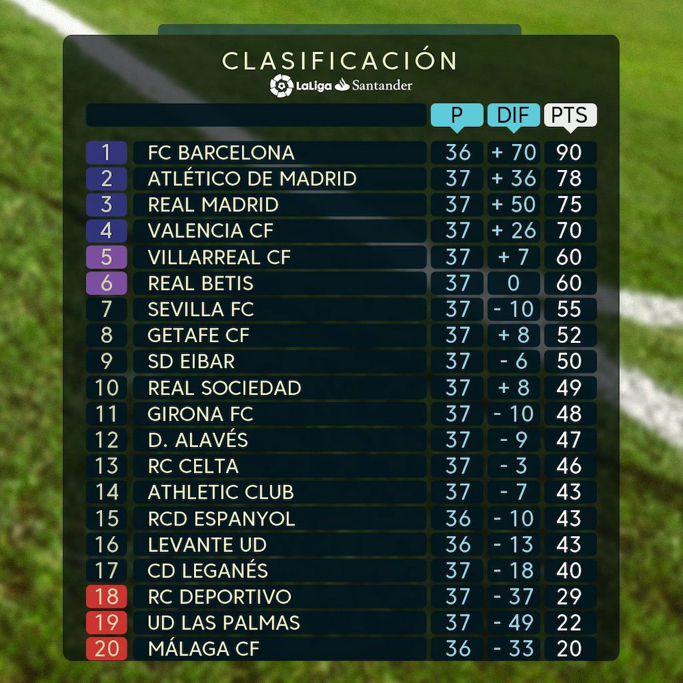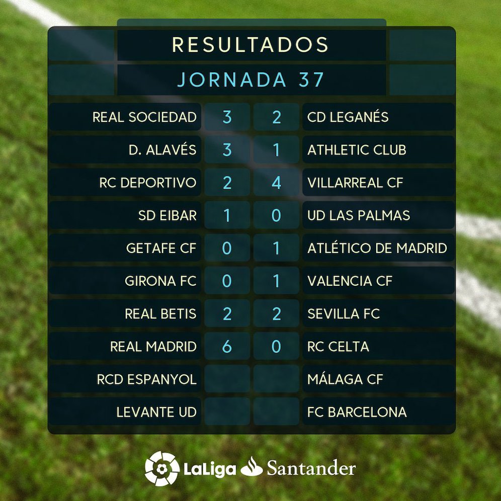 Masih ada dua pertandingan pekan ke-37 yang belum dipentaskan. Dua tim asal Catalunya belum bertanding. Espanyol akan menjamu Malaga pada Minggu malam dan Barcelona akan menjadi tamu bagi Levante, Senin (14/5) dini hari WIB.