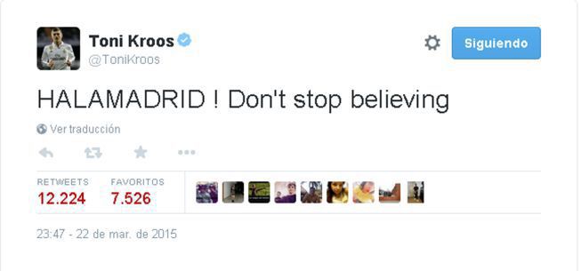 Usai pertandingan berakhir, Kroos langsung menggunakan akun Twitter miliknya dan menuliskan pesan penyemangat yang berbunyi: "HALA MADRID! Saya tidak akan pernah berhenti percaya."