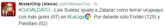 Torehan 68 gol tersebut menjadikan Suarez pemain Uruguay tertajam ketiga dalam sejarah La Liga. Suarez telah melewati ketajaman Jose Zalazar (67 gol) dan kini berada di belakang Diego Forlan (128 gol) serta Walter Pandiani (82 gol).