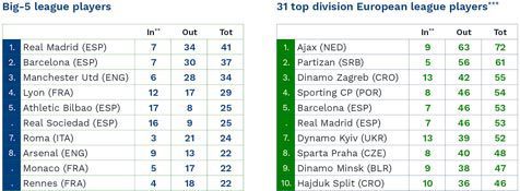 Berdasarkan kriteria itu, Real madrid menjadi klub yang paling banyak memproduksi pemain di lima liga besar Eropa (Spanyol, Inggris, Italia, Jerman, Prancis). Madrid sukses melewati rival utama mereka, Barcelona yang sebelumnya selalu berada di peringkat pertama.
