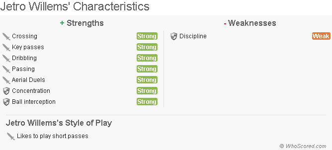 Willems merupakan bek kiri dengan kemampuan nyaris komplet. Interception, dribbling, passing dan crossing Willems sama-sama bagusnya.