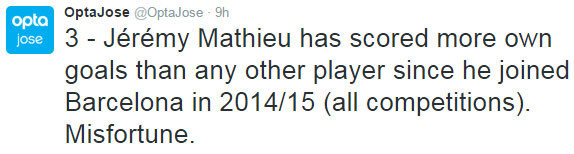 Dengan itu, berarti Mathieu sudah mencetak tiga own goal di semua ajang sejak bergabung dengan Barcelona pada musim 2014/15. Selama periode yang sama, tak ada pemain Barcelona lain yang mencetak own goal lebih banyak daripada bek 32 tahun Prancis tersebut.