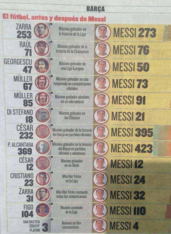 Media Catalan, Mundo Deportivo, belum lama ini membuat rangkuman mengenai beberapa rekor penting yang dibuat oleh Messi di sepanjang karirnya. Dimuat dengan judul 'Sepakbola sebelum dan sesudah Messi', terlihat bahwa La Pulga telah sukses melewati catatan hebat yang dibuat beberapa sosok legenda seperti Telmo Zarra, Gerd Muller, Alfredo Di Stefano, Raul, dan Cesar.