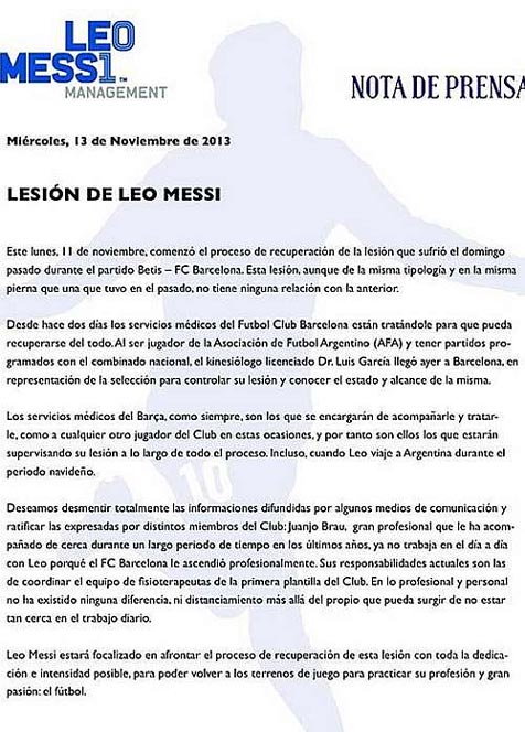 Hal tersebut segera dibantah oleh Leo Messi Management. Mereka mengeluarkan pernyataan bahwa kehadiran fisioterapis Argentina, Luis Garcia, di Barcelona bukan karena Messi bermasalah dengan Brau.
