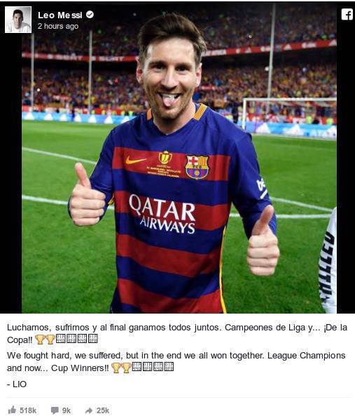 "Kami sudah bekerja keras, kami sudah menderita, namun pada akhirnya kami menang sebagai tim. Pertama, juara La Liga, dan kini, juara Copa!" tulis Messi.