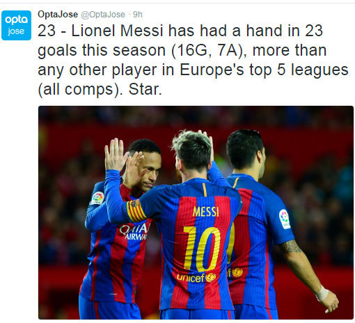Musim ini, Messi sudah berkontribusi langsung terhadap 23 gol Barcelona di semua kompetisi, yakni dengan 16 gol dan tujuh buah assist. Kontribusi gol + assist Messi (23) untuk Barcelona tersebut lebih banyak daripada pemain-pemain lain di lima liga top Eropa musim sejauh ini.