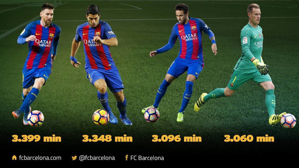 Barcelona sudah memainkan 47 pertandingan resmi musim ini. Dilansir situs resmi Barcelona, Messi memimpin dengan 3.399 menit di atas lapangan. Suarez menguntit dengan 3.348 menit, lalu diikuti Neymar (3.096 menit) dan Ter Stegen (3.060 menit).