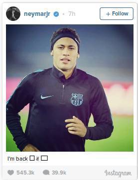 Dan untuk memastikan pada para penggemarnya bahwa ia sudah siap untuk kembali beraksi, andai Barca masuk ke babak final atau mendapat sedikit menit bermain dari Luis Enrique, Neymar belum lama ini mengunggah foto anyar di Instagram dan tak lupa menambah pesan: "Saya sudah kembali."