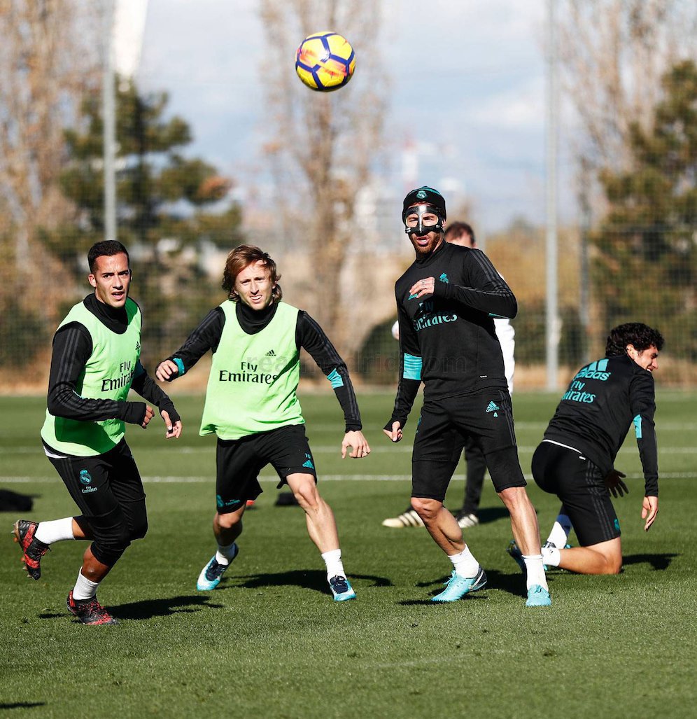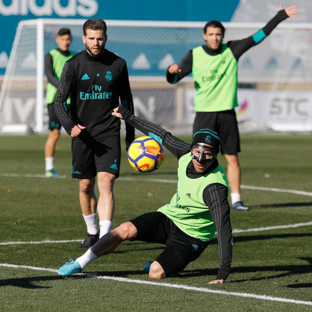 Bola.net - - Kapten Real Madrid, Sergio Ramos tampil dengan gaya yang berbeda dari penampilan bisanya. Pada sesi latihan Madrid, Ramos kini tampil dengan memakai topeng untuk melindungi beberapa area di wajahnya.
