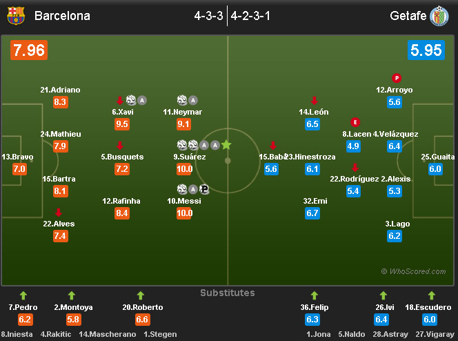 Messi mengukir dua gol dan satu assist, sedangkan Suarez dua gol dan dua assist, sementara Neymar punya satu gol dan satu assist atas namanya. Untuk pertama kalinya, MSN mencetak gol dan assist dalam satu laga yang sama.