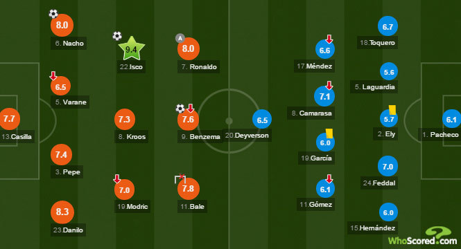 WhoScored memberi Isco rating 9,4 dalam laga ini, lebih tinggi daripada pemain-pemain lainnya.