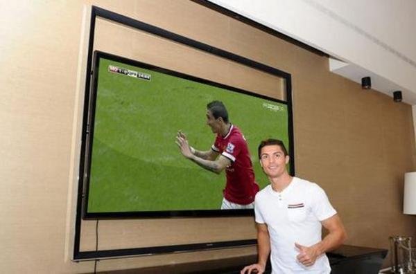 Ronaldo terlihat berdiri di depan sebuah layar TV berukuran besar dan mengacungkan jempolnya, sementara layar sedang menampilkan Di Maria yang sedang merayakan golnya dengan berseragam United.