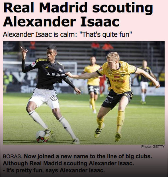 Menurut laporan media Swedia Aftonbladet seperti dilansir Daily Express, tim pencari bakat dari Madrid datang langsung ke Swedia untuk melihat penampilan Isak ketika bermain bersama AIK Solna tengah pekan lalu.
