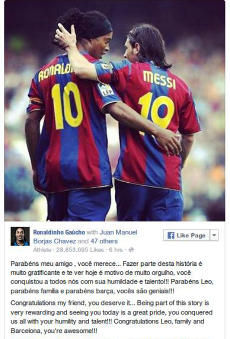 Ronaldinho, yang kini bermain untuk klub Meksiko, Queretaro, menggunakan akun Facebook resmi miliknya untuk mengucap selamat pada Messi dalam tiga bahasa berbeda: Spanyol, Portugal, dan Inggris.